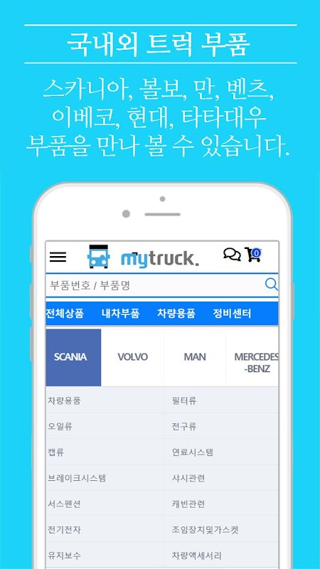 스카니아, 볼보, 벤츠, 만, 이베코, 현대, 타타대우 등 상용차부품, 상용차용품 판매 및 정비예약. 트럭부품, 트럭용품, mytruck