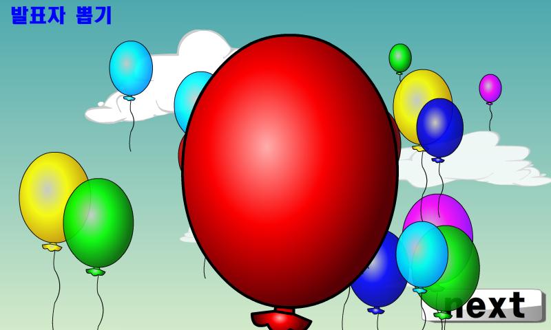 발표자를 뽑는 프로그램입니다. 순위를 선정하거나 번호를 뽑을때도 사용할 수 있습니다. 풍선을 누르면 터지면서 무작위로 번호가 나타납니다.