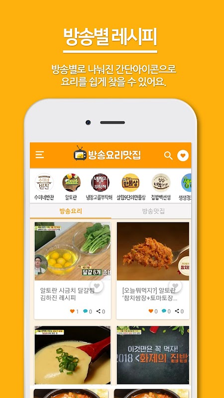 방송별로 나눠진 간단한 아이콘으로 요리 레시피를 쉽게 찾을 수 있어요.