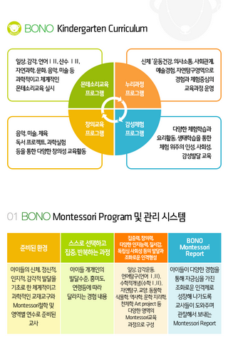 아동중심의 전인교육인 Montessori Program 및 누리교육과정 프로그램과 유 . 초등기에 맞춘 체계적인 BONO English Program, 그리고다양한 창의교육 Program으로 유아기 최고 . 최적 교육이 이루어지는 아이들만의 교육 문화 공간.