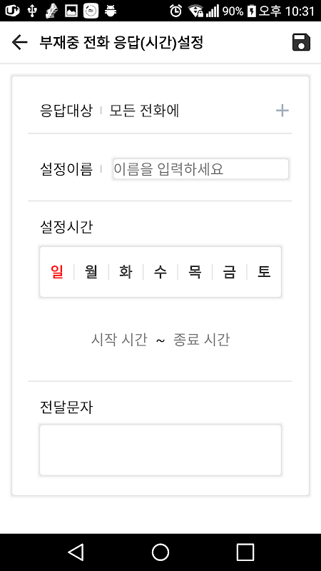 5. "부재중 전화 문자 응답(시간)" > 요일별 + 시간 설정을 하면 정해진 요일과 시간에 맞는 자동 응답 메시지를 전달 합니다.(중복 주의)