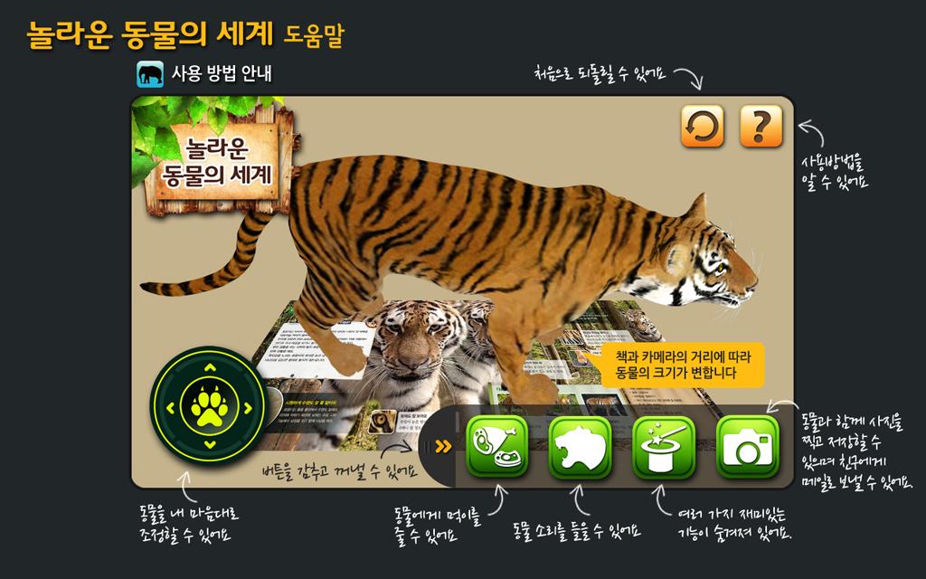 블루래빗동물은 증강현실을 기반으로 책의 이미지를 인식하여 페이지 별로 연관된 증강현실 애니메이션을 보여주는 어플리케이션 입니다.