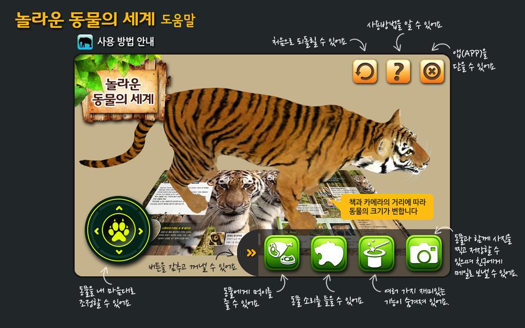 - AR(Augmented Reality, 증강현실)을 기반으로 다양한 증강현실 책의 이미지를 인식하여 페이지 별로 해당 내용과 연관된 증강현실 애니메이션을 보여주는 어플리케이션 입니다.
