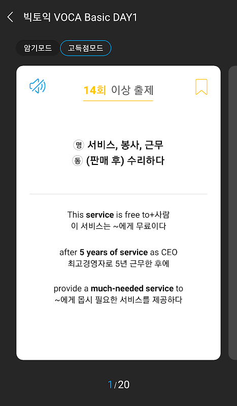 - 암기모드로 단어, 뜻만 간략하게 암기하거나 고득점모드로 자세한 설명까지 제공합니다.