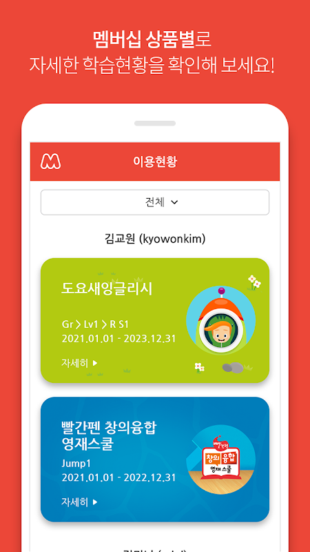 Se você entrar no Red Pen Smart Mom com o ID integrado, você pode verificar o status de uso de todos os serviços de aprendizagem de professores registrados. Para serviços de aprendizagem que não estão disponíveis no momento, eles serão fornecidos no futuro por meio de uma atualização.