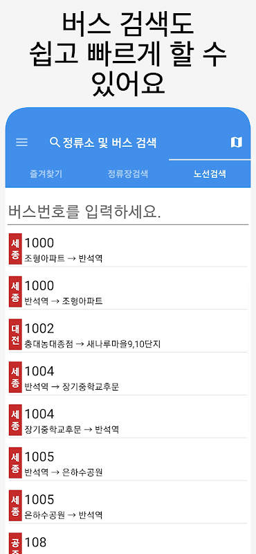 Você pode pesquisar convenientemente por informações de parada de ônibus Sejong e informações de rota.