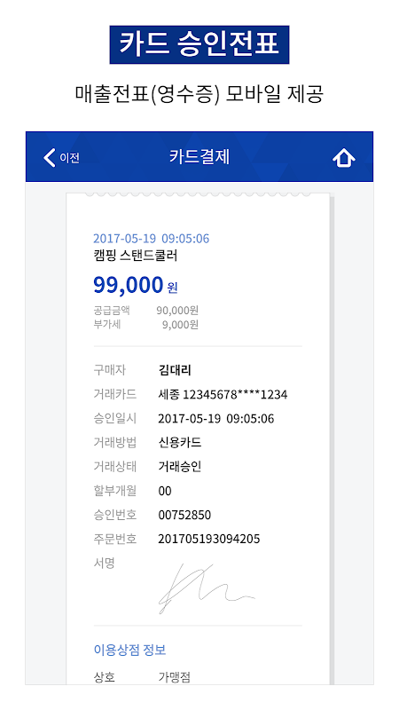- SNS 메신저, SMS 등으로 구매자에게 매출전표(영수증) 전달이 가능합니다.