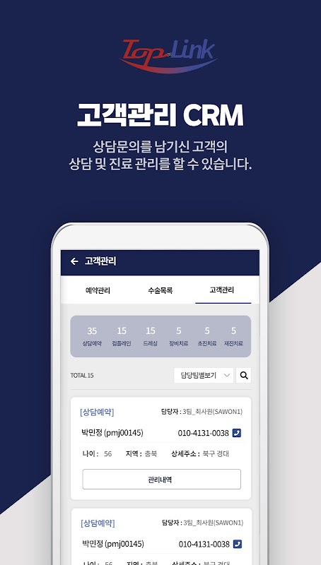 Gerenciamento de clientes (pacientes) Com o CRM, você pode gerenciar consultas e tratamentos de clientes. Além disso, é possível trabalhar sem problemas no celular, vinculando perguntas frequentes e salas de dados.