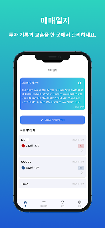 Identifique seus padrões de investimento e reduza erros por meio de diários de negociação e máximas de ações para aprimorar suas habilidades de investimento. O aplicativo de diário de negociações será seu companheiro mais confiável em sua jornada de investimentos.