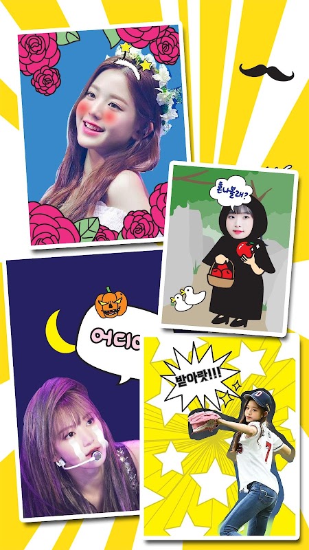 아이즈원 사진을 자르고, 붙히고, 스티커로 꾸미면서 예쁘고 재미있는 이모티콘을 만들 수 있어요!