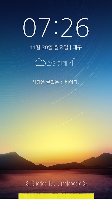 원하는 이미지의 배경화면을 설정 할수 있으며 날짜, 시간, 위치하는 곳의 날씨도 보여줍니다.