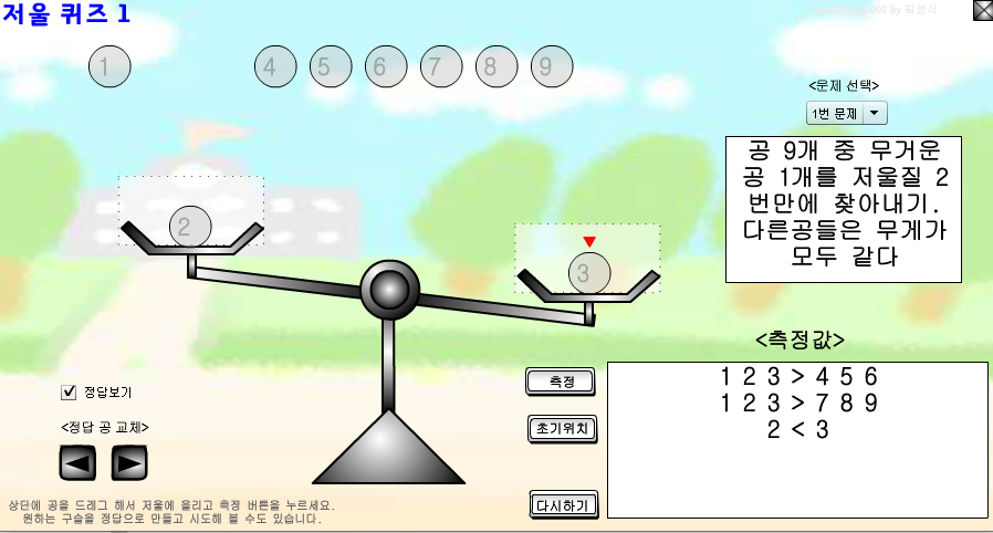 위에 나타난 공을 드래그 해서 윗접시 저울 위에 사각형 영역에 끌어다 놓고 측정 버튼을 누르면 측정이 된다. 초기위치는 공들을 원래 위치로 보내는 버튼이고, 다시하기는 처음부터 다시하는 버튼이다. 다시하기를 눌러도 정답 공의 위치는 바뀌지 않는다.