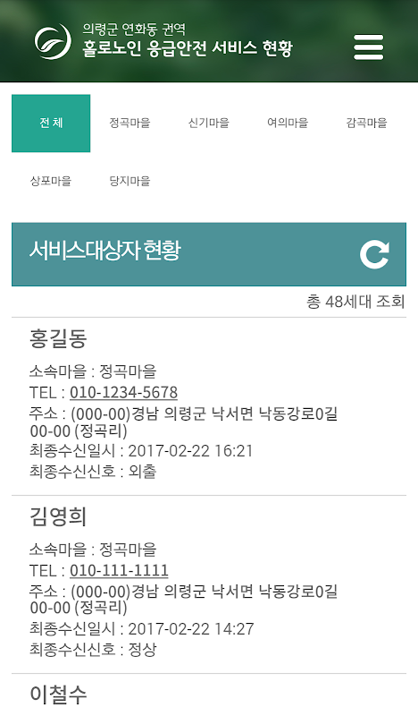 전체현황 : 연화동 마을별 정상적인 서비스 , 미감지자, 미수신자, 외출자, 정전된자 세대수 정보를 보여준다.