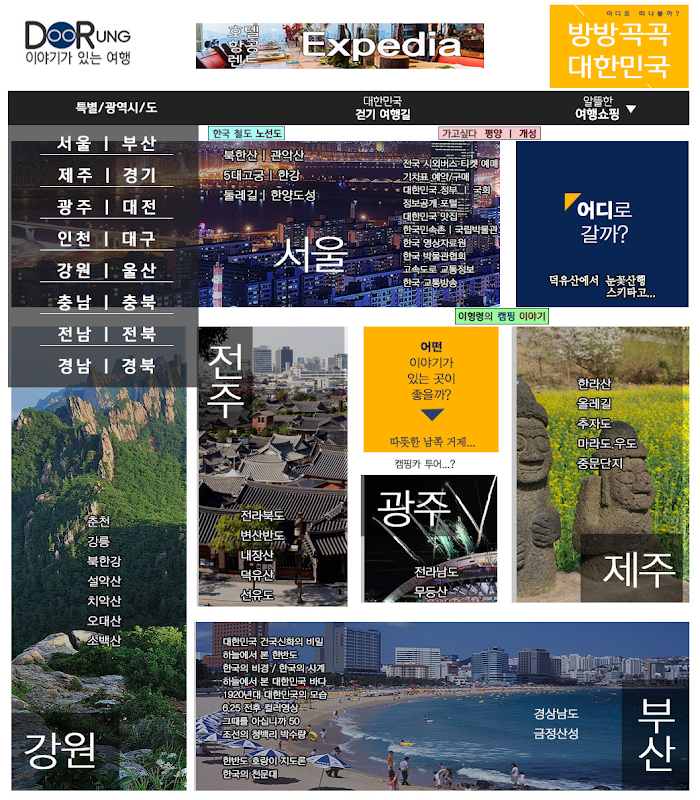 서울 여행, 부산 여행/대구 여행/인천 여행/광주 여행/대전 여행/울산 여행, 경기도 여행(파주 여행/남양주 여행/용인 여행), 강원도 여행(춘천 여행/강릉 여행/평창 여행), 충청도 여행(충주 여행/청주 여행/공주 여행/부여 여행), 전라도 여행(신안 여행/진도 여행/완도 여행/여수 여행/전주 여행/군산 여행), 경상도 여행(통영 여행/남해 여행/거제 여행/경주 여행/안동 여행), 제주도 여행(중문단지 여행/마라도 여행/우도 여행/추자도 여행/제주 둘레길 여행) 및 주요 관광도시별 여행정보 안내