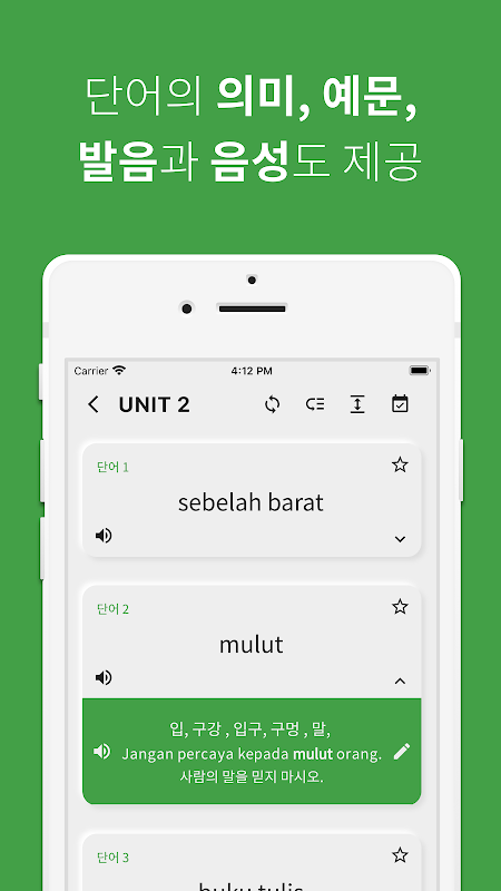 - Oferece a capacidade de revisar palavras em indonésio por parte, unidade e idioma inteiro