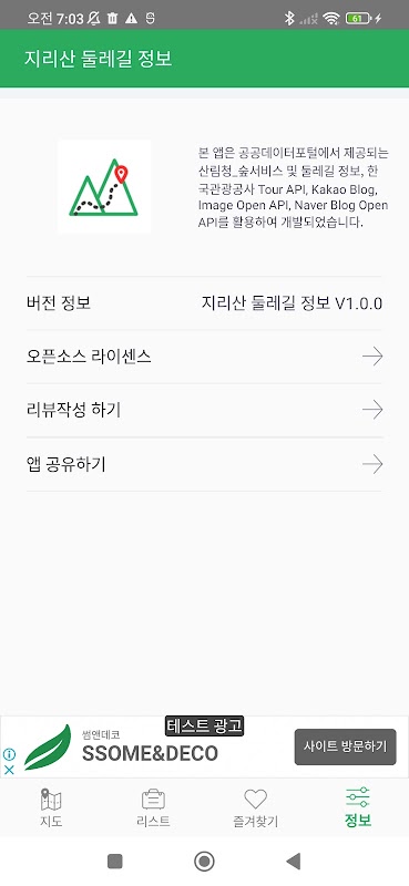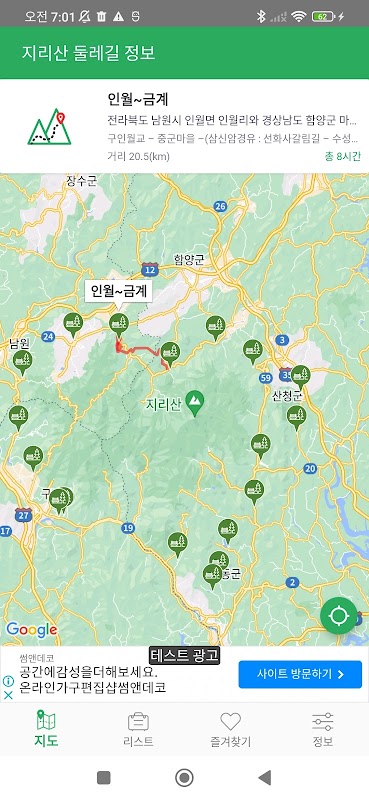 O aplicativo de informações Jirisan Dulle-gil fornece informações de localização sobre o Dulle-gil usando dados da API.