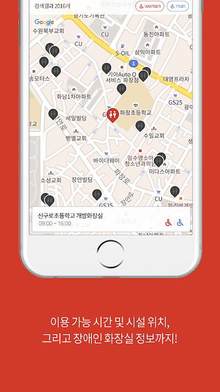 필터링을 통해 장애인이 사용할 수 있는 화장실 필터링이 가능합니다.