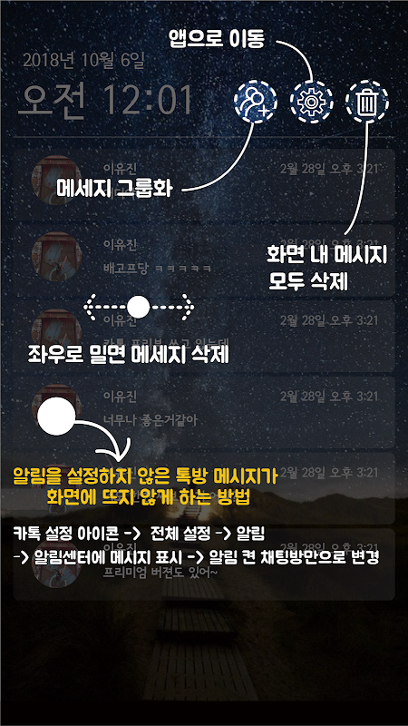 수신한 카톡들이 마지막 메시지만 표시되어 많이 불편하셨죠? 이제 안드로이드에서도 수신한 모든 카톡이 화면에 쌓입니다. 카톡과 페이스북 알림을 설정하여, 이제 카톡 프리뷰에서 새로온 카톡을 확인할 수 있습니다. 없어진 대화내역은 앱화면에서 확인할 수 있습니다.