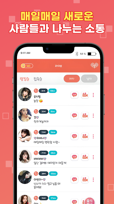 - Ao vivo: você pode conferir todos os membros do Cam&Talk que estão conectados ao aplicativo. Você pode conferir a outra pessoa por meio de foto, apelido, idade, distância de você, conteúdo do tópico, etc., e pode fazer uma videochamada com a pessoa de sua preferência enviando uma mensagem ou solicitando um chat de vídeo.