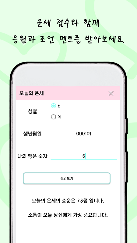 Existem três jogos de adivinhação: fortuna de hoje, fortuna amorosa e fortuna riqueza. Você pode testar sua sorte de uma maneira fácil e divertida com pontuações de fortuna e palavras simples de incentivo e conselhos, em vez de palavras difíceis.