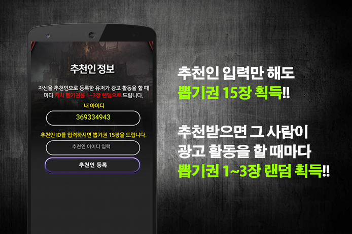 친구가 광고 활동을 할 때 마다 1~3장의 캐시뽑기권을 매 횟수마다 드립니다.