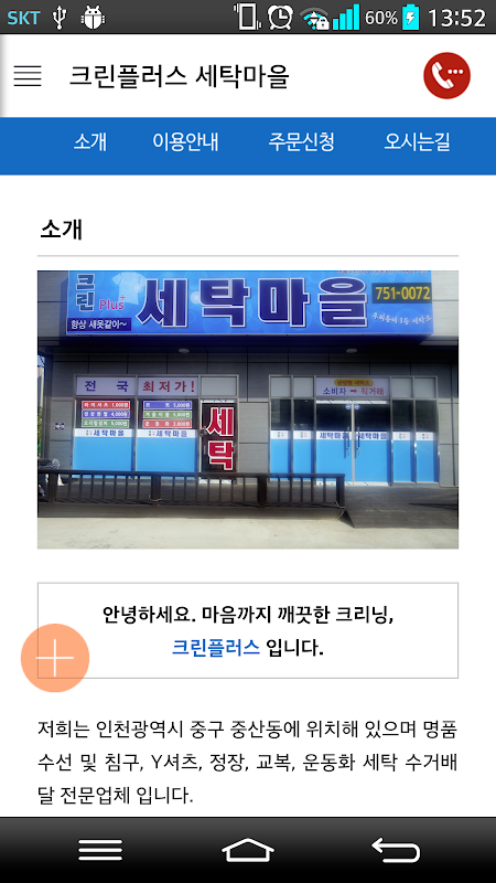 저희는 인천광역시 중구 중산동에 위치해 있으며 명품수선 및 침구, Y셔츠, 정장, 교복, 운동화 세탁 수거배달 전문업체 입니다.