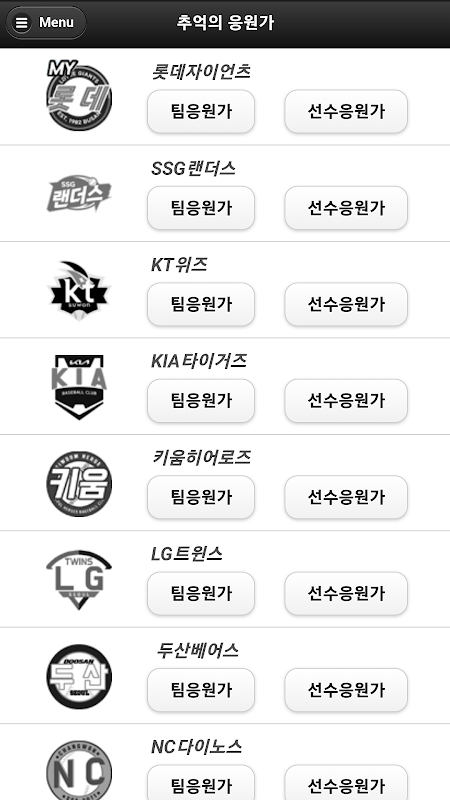 As músicas de torcida profissional de beisebol incluem músicas de torcida de times, músicas de torcida de jogadores e músicas de aparência de jogadores de 10 times (Doosan Bears, LG Twins, Lotte Giants, KIA Tigers, Samsung Lions, SSG Landers, Hanwha Eagles, Kiwoom Heroes, NC Dinos, kt wiz). Você pode encontrar facilmente uma música de torcida procurando por um jogador e pode aprender facilmente uma música de torcida repetindo a fonte de som em Configurações.