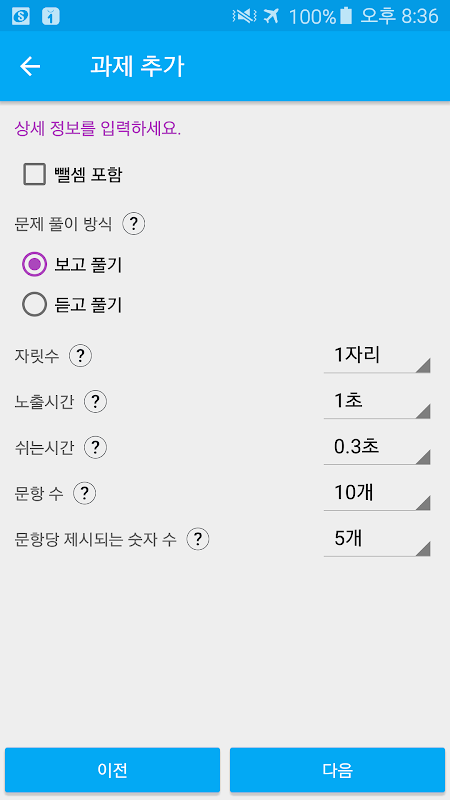 1. O tipo de problema (disso, a divisão, multiplicação), o número de dígitos, tempo de exposição, perguntas sudeung permite aos utilizadores para executar uma tarefa feito livremente configurada como desejado.