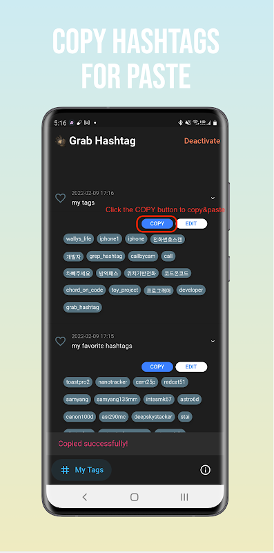 사례2) SNS를 하는 중에 사용해 보고 싶은 해시태그들이 있는데 앱에서 복사가 안 될 때...