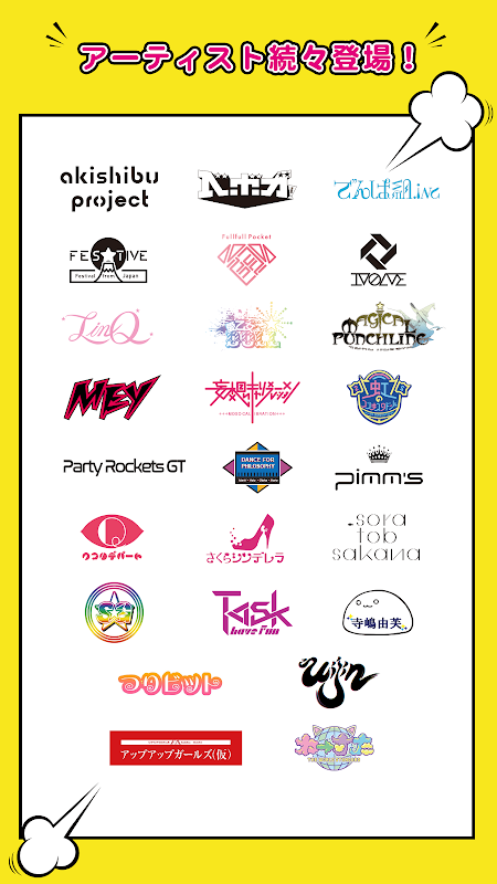 projeto Akishibu / Up Ups (provisório) / IVOLVE / uijin / departamento Kumari loja / Sakura Cinderella / SUPER ☆ GIRLS / sora tob sakana / Tarefa se divertir / Pesca bit / propagação definir .inc / Festa Rockets GT / Pimm / filosofia da dança / Fullfull Pocket / FES ☆ TIVE / Beboga! / Mágica punch line / LinQ / Worth foi / amor de solteira ☆ DOLL / arco-íris de Conquistador calibração / ilusão (em ordem alfabética)