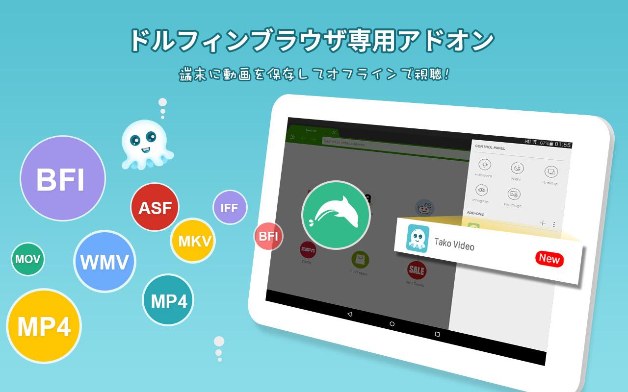 Tako Video - 無料動画ダウンロード・再生用アプリは、ドルフィンブラウザ専用の簡単便利な動画ダウンローダ(Downloader)です。インターネット上に一般公開された動画をお使いのAndroid端末にダウンロード・保存して、オフラインで動画を再生することは可能です。オンライ・オフライ問わず、好きなときに、お気に入りの動画の再生ができます。ログインもなし、しかも無料かつ高速!誰でも使いやすい最強の動画ダウンローダ(Downloader)です!