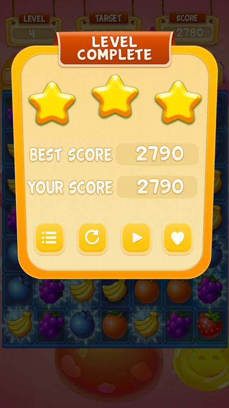 Playing Rules: You should connect 3 or more same fruit to score points. the more fruit you connect the more mark you archive. try to accumulate as much score as you can to break the target score. Only Break target score, you can unlock the next level, It very challenging !