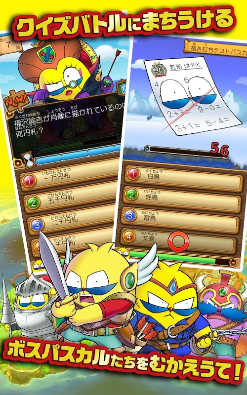 ボスとのバトルやバトルマスではクイズで対決だ!クイズに正解して敵にダメージを与えろ!もちろん間違うとダメージを受けてしまう。それにしてもパスカル先生なのにクイズがガチなんて聞いてないよ~!むずかしいクイズはお父さんやお母さんにお任せだ!