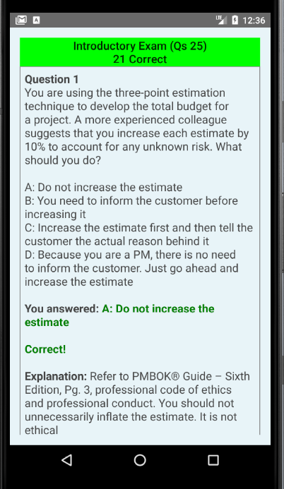 6. Each simulated exam should follow a thorough review and understanding of your weak areas by looking at explanation for incorrectly answered questions with reference to PMBOK® sixth edition