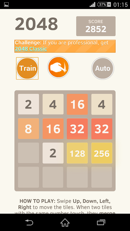 Swipe (Up, Down, Left, Right) to move the tiles. When two squares with the same number touch they merge into a one tile or a larger number (2 + 2 = 4, 4 + 4 = 8, and so on). When 2048 tile is created, the player wins!