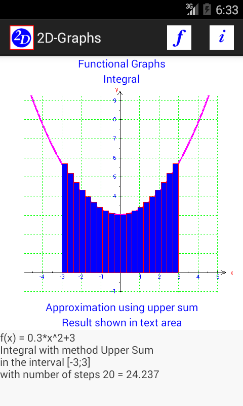 O aplicativo 2D Gráficos oferece a representação gráfica de gráficos funcionais do tipo f (x) ou (x (t), y (t)). Compreende o cálculo de cruzamentos, zeros e extremos. Uma especialidade é o desenvolvimento da definição integral com um número de métodos. Entre estes são somas superiores e inferiores, trapézio e método de Simpson, que mostram uma aproximação do valor integral. Além disso pode ser calculada a área betwenn dois gráficos. Para cada gráfico, você pode definir um local, onde o programa calcula a inclinação e chama a tangente correspondente.