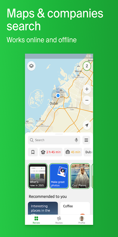 Use o 2GIS World para suas tarefas diárias na cidade ou leve-o para novos lugares: