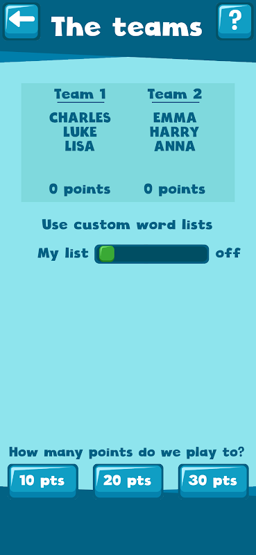 Um jogo de "30 segundos" é jogado com 2 ou mais equipes. Um membro da equipe tenta descrever 5 palavras ou frases para os outros membros da equipe em meio minuto. Cada palavra correta recebe um ponto. A equipe com mais pontos ganha o jogo!