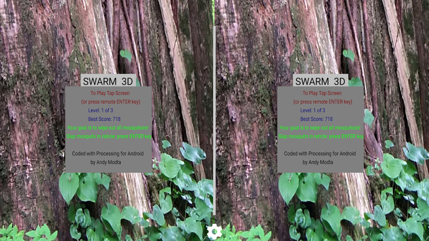 To play, move your head to position the centered reticle pointer over a mosquito and then give it a swat with a magnet pull, screen tap, external USB keyboard ENTER key, or Bluetooth remote controller ENTER key. If you miss, a new mosquito will be added to the swarm, lowering your point score. The game score results from the number of swats minus bites over the shortest time, until you eliminate all mosquitoes on all levels.