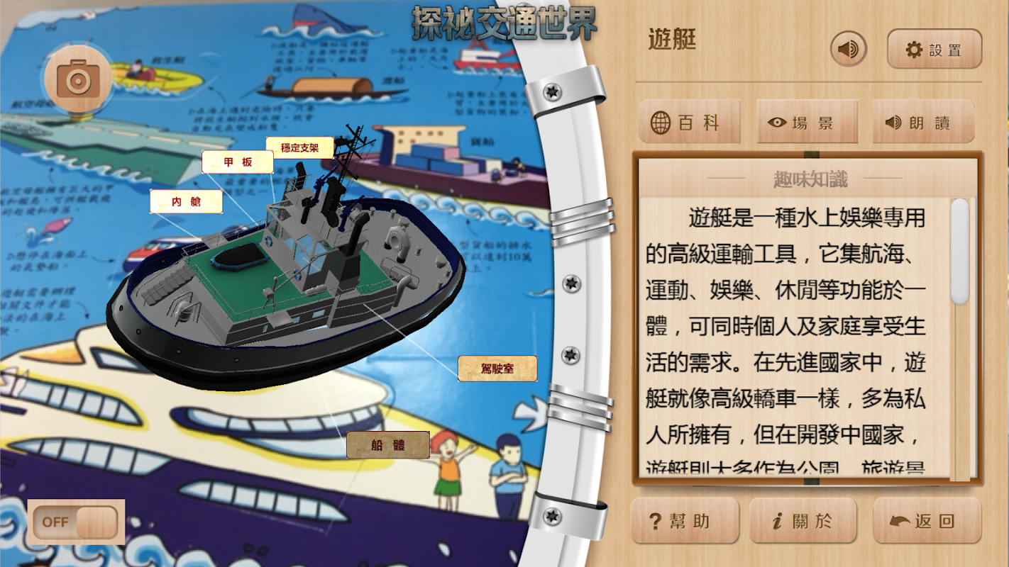 探祕交通世界是壹款兒童知識百科圖書APP,通過AR及三維實時渲染等技術,讓3D交通工具形象栩栩如生地展現在圖書裏,並配知識講解及分部知識介紹。