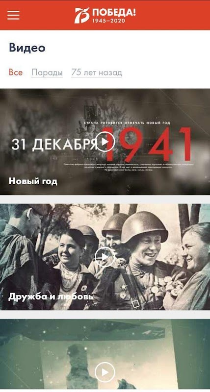 Aqui você pode assistir a vídeos de projetos especiais da celebração oficial do 75º aniversário da vitória, bem como a desfiles em arquivos de arquivos.