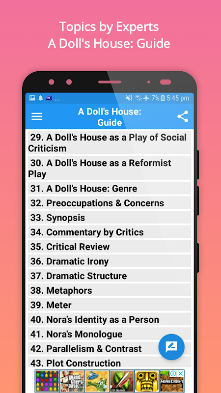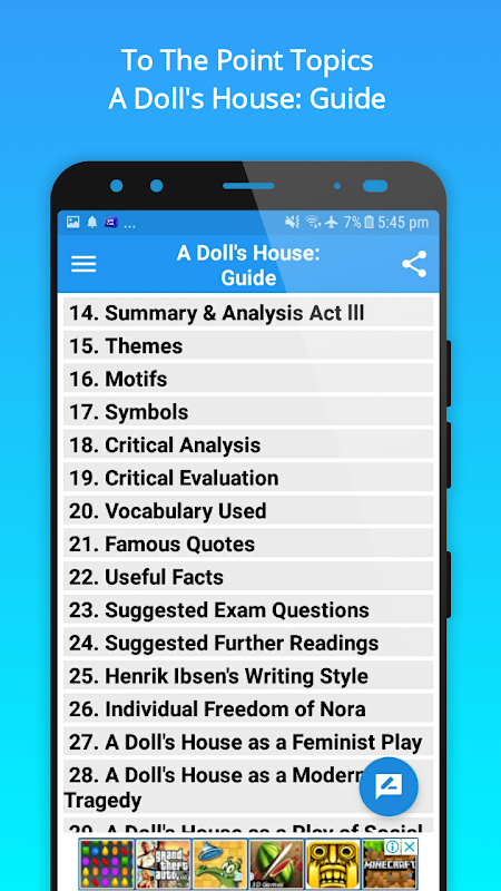 Este aplicativo Guia funciona on-line e off-line e contém 45 tópicos básicos sobre uma das peças famosas de Henrik Ibsen, A Doll's House.