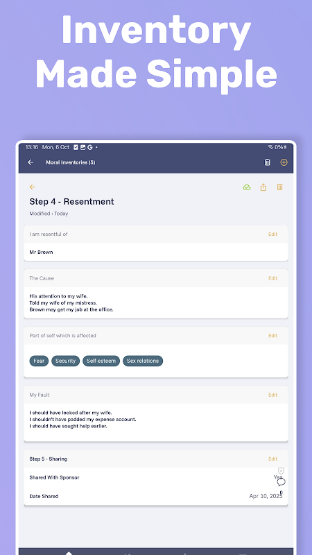 Crie facilmente inventários com base no método Big Book – ressentimento, medo, sexo e danos causados.