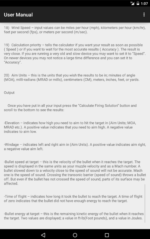 -A comprehensive User Manual (Help) is integrated into the app. The Help document teaches fundamentals and nuances of extremely long range shooting.