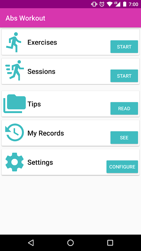 1.- Depois de ter baixado o aplicativo, você verá que o menu principal possui opções diferentes: exercícios abdominais, sessões ou rotinas, dicas, registros e configurações.