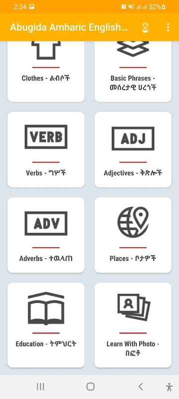 Este aplicativo possui frases e vocabulários bem organizados com base em conceitos como Comida, Tempo, Números, Animais, Adjetivos, verbos, Frases Básicas e muitos mais. Alguns dos recursos do aplicativo incluem