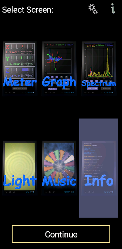 Visualize ou registre a saída do sensor do acelerômetro. O aplicativo tem seis telas para escolher:
