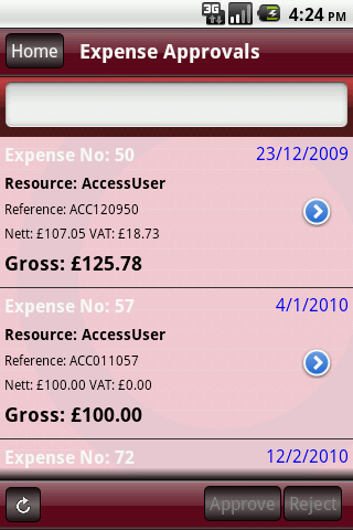 Absences,timesheets, purchase requests and expenses entered into FocalPoint or expenses entered via Access Mobile enter an approval workflow, configured to suit your business. Information is sent ready-formatted to the end user, making it easy to filter submissions by name, value or project code and quickly make a decision whether to approve or reject. Rejected submissions can be accompanied by notes before being returned to the originator, allowing you to indicate for example, erroneous or missing information.