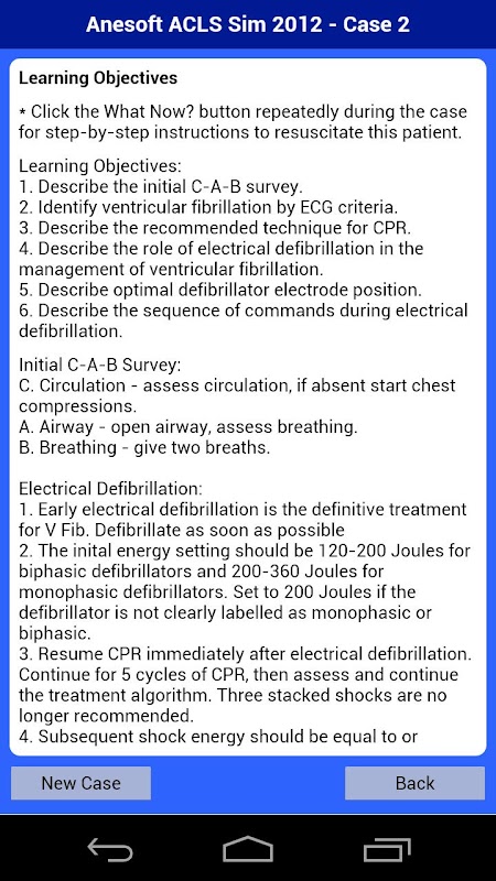 The 12 case scenarios included with this app were written by Howard Schwid, MD. The first three cover ventricular fibrillation, the next two are for pulseless ventricular tachycardia, another covers asystole, and the remainder of the cases cover the tachycardia algorithm. The Lite version includes case 1 only.