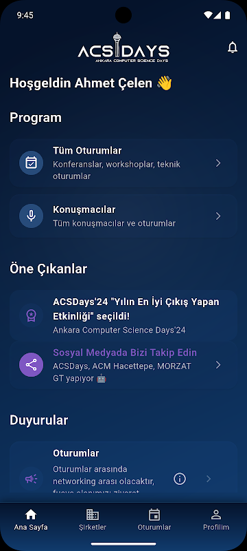 Programa Etkinlikı; salonlar, saatler e konuşmacılar hakkında ayrıntılı bilgi içerir. Kullanıcılar, ilgi duydukları oturumları önceden görüntüleyebilir and program akışını kolay bir şekilde takip edebilir.